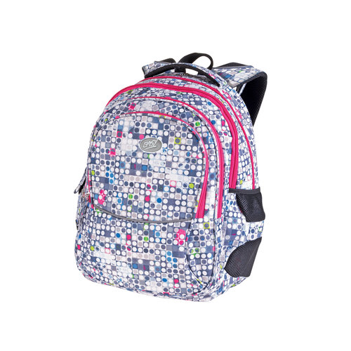 Funkcjonalny 4 komorowy plecak szkolno-sportowy: - 4 komory zapinane na zamek, - kieszeń na laptopa, kieszeń z organizerem, dwie kieszonki z boku np. na napoje - funkcjonalne wejście na słuchawki, - wygodny uchwyt do przenoszenia dodatkowo wzmocniony tworzywem, - szelki wzmocnione i podszyte specjalną gabką, - wyprofilowana tylnia ścianka plecaka podszyta miękkim materiałem, - wykonany z metriałów zapewniających dobrą cyrkulację powietrza, - elementy odblaskowe z przodu plecaka. Materiał: Poliester 1680 i 600D