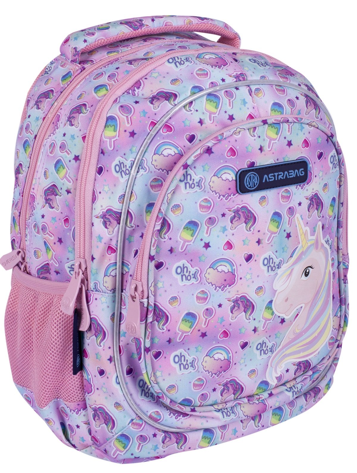 Poczuj się jak bohaterka swoich ulubionych kreskówek i stwórz własną historię z bajkowym plecakiem trzykomorowym Astrabag. Piękny pudrowy róż oraz pastelowy motyw jednorożców z całą pewnością skradnie serce niejednej dziewczynki zakochanej w tych baśniowych i mitycznych stworzeniach. Plecak szkolny cechuje się kompaktowymi wymiarami oraz niewielką wagą. Plecak szkolny Astrabag posiada trzy funkcjonalne komory wyposażone m.in. w praktyczną kieszonkę oraz organizer na drobiazgi. Zastosowano w nim najnowszą technologię Ergo Back minimalizującą naciski na barki i kręgosłup oraz zapewniającą poczucie komfortu dziecka. Dzięki niej ciężar na plecach rozkłada się równomiernie bez uciskania ramion.