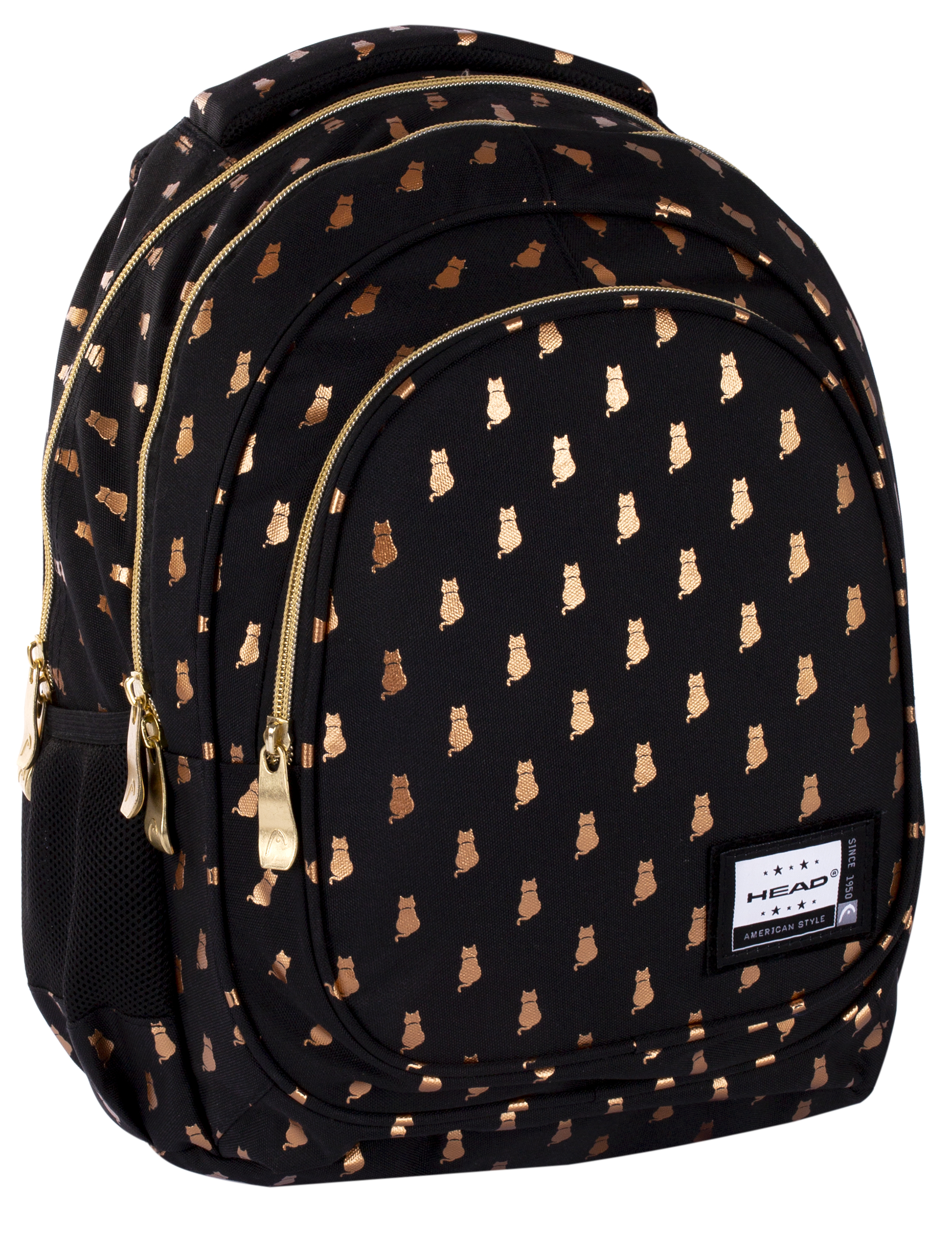 Czarny trzykomorowy plecak Head z motywem malutkich złotych kotków został zaprojektowany z myślą o wszystkich miłośnikach mruczków.