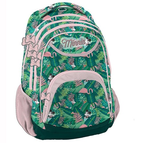 Plecak szkolny Minnie zielono-różowy. Posiada trzy pojemne komory, kieszeń przednią z organizerem zamykaną na zamek oraz dwie boczne kieszonki wykonane z siatki, które pomieszczą butelkę, bidon czy termos. W komorze głównej znajduje się przegroda (na laptop), w drugiej komorze organizer z kieszenią na zamek oraz uchwyt na klucze. Wzmocnione profilowane plecy oraz miękkie, regulowane szelki sprawiają, że plecak nosi się niezwykle komfortowo. Plecak posiada wygodny uchwyt do przenoszenia, uszko do powieszenia oraz elementy odblaskowe dla zwiększenia bezpieczeństwa na drodze lub po zmroku. Ze względu na swój rozmiar, plecak to idealne rozwiązanie zarówno dla nastolatków, jak i dla młodszych dzieci. W Paso sięgamy po nowoczesne wzornictwo, nie zapominając o tym, by oferować solidne i praktyczne produkty.