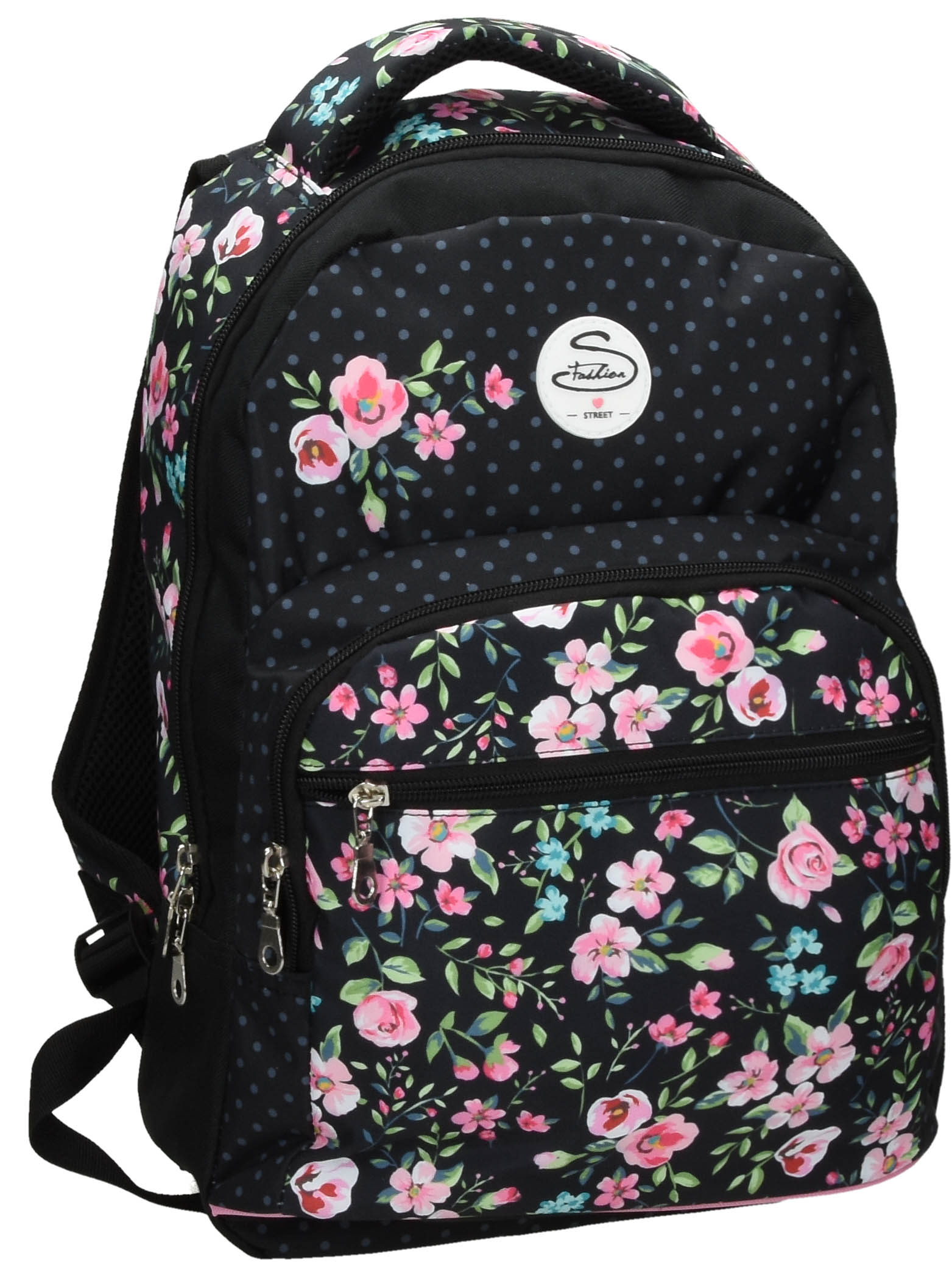 Cudowny plecak młodzieżowy wykonany z miękkiego przyjemnego materiału. Starannie wykończony, o niebanalnym wzornictwie sprawia, że nie mamy ochoty się z nim rozstawać. Cechy: - modne kwiatowe wzornictwo - komora główna zamykana na suwak - mała kieszonka wewnętrzna zamykana na suwak - kieszeń przednia zamykana na suwak - eleganckie obszycie wewnętrzne w stonowanym kolorze - szerokie, miękkie szelki Trendy Lifestyle STREET® since 1989. Wymiary: 27,5 x 10,5 x 41,5 cm Waga: 0,5 kg