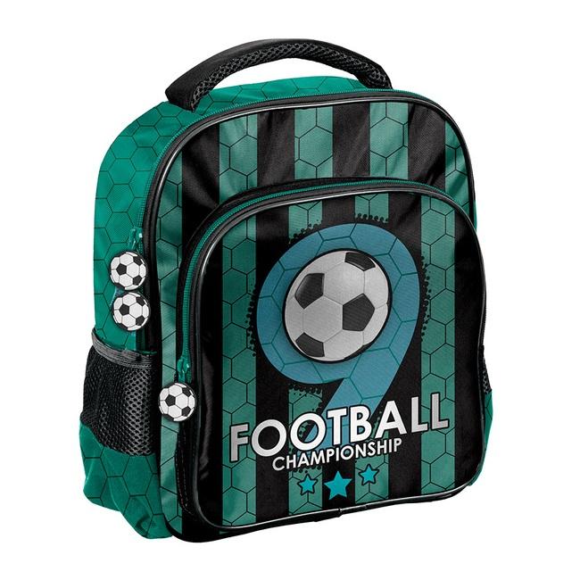 Plecak szkolny Paso Football Championship. Idealny dla dzieci, które idą do zerówki "0". Plecak ma usztywnione lekko plecy, uchwyt do przenoszenia oraz regulowane i wyściełane gąbką szelki. Dwie boczne kieszenie z siatki mieszczą bidon, małą butelkę lub termos. Waga: 490 g Rozmiar: 32x27x10,5