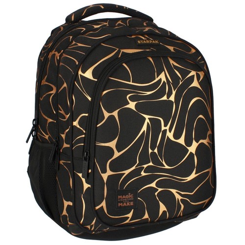 Plecak składa się z 1 dużej komory i 2 obszernych przednich kieszeni, w środku komór znajdują się organizery, 2 boczne wzmocnione kieszenie siatkowe na butelkę z napojem, wytrzymałe zamki błyskawiczne, plecak wykonany z mocnego materiału poliestrowego 600D specjalnie powlekanego wodoodporną warstwą, ergonomiczne plecy i szelki ,plecy z systemem wentylacji dla większego komfortu, grube, miękkie szelki chronią ramiona, regulowane szelki pozwalają dopasować plecak do wzrostu i budowy ciała, uchwyt w środku usztywniony, pozwalając zawiesić plecak na wieszaku lub wygodnie nosić go w ręce, odblaskowe paski umieszczone na szelkach zwiększające widoczność plecaka w nocy (bezpieczeństwo dziecka). Plecak w czarno-złotych kolorach. Wygodny i funkcjonalny plecak szkolny STARPAK z młodzieżową grafiką z serii Gold. Użytkowanie takiego plecaka to czysta przyjemność.