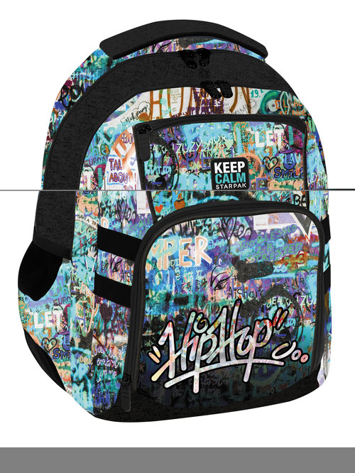 Wygodny i funkcjonalny plecak szkolny Starpak z młodzieżową grafiką Graffiti. Użytkowanie takiego plecaka to czysta przyjemność. Zapoznaj się również z innymi produktami Starpak z serii dedykowanej młodzieży! Plecak szkolny składa się z dwóch komór zapinanych na zamek, co pozwoli na lepsze zorganizowanie wewnętrznej przestrzeni. Na zewnątrz znajduje się bardzo obszerna przednia, zapinana kieszeń, po bokach dwie kieszenie ze ściągaczem na umieszczenie w nich bidonu z napojem. Plecy i szelki wyściełane gąbką zapewniają komfort użytkowania i równomierne rozłożenie obciążenia na plecach dziecka. Wykonany z trwałego materiału wykończonego elementami odblaskowymi dla większego bezpieczeństwa. Plecak jest wyrobem tekstylnym. Przeznaczony dla dzieci w wieku: 3+. Wymiary produktu (wys.x szer. x gł.) [cm] 46,5x33,5x25.