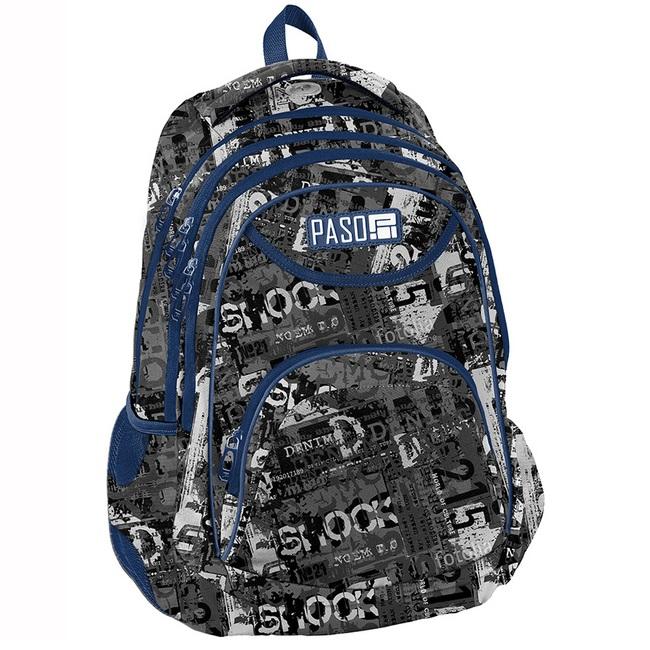 Plecak szkolny granatowo-szary. Posiada trzy pojemne komory, kieszeń przednią z organizerem zamykaną na zamek oraz dwie boczne kieszonki wykonane z siatki, które pomieszczą butelkę, bidon czy termos. W komorze głównej znajduje się przegroda (na laptop), w drugiej komorze organizer z kieszenią na zamek oraz uchwyt na klucze. Wzmocnione profilowane plecy oraz miękkie, regulowane szelki sprawiają, że plecak nosi się niezwykle komfortowo. Plecak posiada wygodny uchwyt do przenoszenia, uszko do powieszenia oraz elementy odblaskowe dla zwiększenia bezpieczeństwa na drodze lub po zmroku. Ze względu na swój rozmiar, plecak to idealne rozwiązanie zarówno dla nastolatków, jak i dla młodszych dzieci. W Paso sięgamy po nowoczesne wzornictwo, nie zapominając o tym, by oferować solidne i praktyczne produkty.