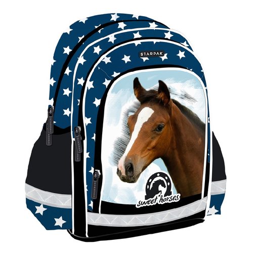 Wygodny i funkcjonalny Plecak szkolny z kolekcji Starpak z licencją Horses składający się z dwóch komór zapinanych na zamek, co pozwoli na lepsze zorganizowanie wewnętrznej przestrzeni. Na zewnątrz znajduje się bardzo obszerna przednia, zapinana kieszeń, po bokach natomiast dwie kieszenie ze ściągaczem na umieszczenie w nich bidonu z napojem. Plecy i szelki wyściełane zostały gąbką zapewniającą komfort użytkowania i równomierne rozłożenie obciążenia na plecach dziecka. Plecak wykonany z trwałego materiału wykończonego elementami odblaskowymi dla większego bezpieczeństwa. Zapoznaj się również z innymi produktami Starpak z serii Horses! Plecak jest wyrobem tekstylnym. Przeznaczony dla dzieci w wieku: 3+. Wymiary produktu(wys.x szer. x gł.) [cm]: 39x29x19,5.