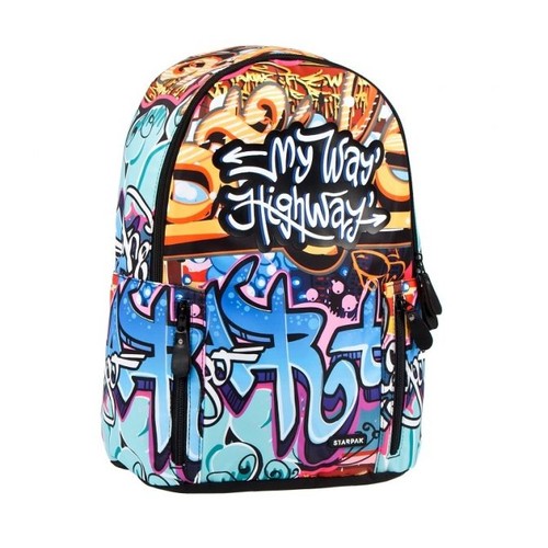 Kolorowy, inspirowany street artem i graffiti plecak z pewnością przypadnie do gustu młodzieży, która w odważny sposób lubi wyrażać swój styl. Plecak posiada jedną dużą komorę zamykaną na zamek, wewnątrz której znajduje się organizer i kieszeń na laptop. Na zewnątrz plecaka umieszczone zostały dwie kieszonki, które pomieszczą podręczne drobiazgi. Z takim plecakiem żaden nastolatek nie pozostanie niezauważony!