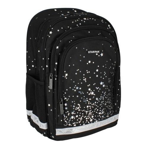 Plecak składa się z 1 dużej komory i 2 obszernych przednich kieszeni, 2 boczne wzmocnione kieszenie siatkowe na butelkę z napojem, wytrzymałe zamki błyskawiczne, plecak wykonany z mocnego materiału poliestrowego 600D specjalnie powlekanego wodoodporną warstwą, ergonomiczne plecy i szelki ,plecy z systemem wentylacji dla większego komfortu, grube, miękkie szelki chronią ramiona, regulowane szelki pozwalają dopasować plecak do wzrostu i budowy ciała, uchwyt w środku usztywniony, pozwalając zawiesić plecak na wieszaku lub wygodnie nosić go w ręce, odblaskowe paski umieszczone na szelkach zwiększające widoczność plecaka w nocy (bezpieczeństwo dziecka). Plecak w srebrno-czarnej kolorystyce, posiada grafikę w holograficzne gwiazdki. Wygodny i funkcjonalny plecak szkolny STARPAK z młodzieżową grafiką. Użytkowanie takiego plecaka to czysta przyjemność. Zapoznaj się również z innymi produktami STARPAK dedykowanymi młodzieży! Wykonany z trwałego materiału wykończonego elementami odblaskowymi dla większego bezpieczeństwa. Plecak jest wyrobem tekstylnym.