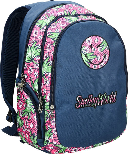 Wspaniały plecak młodzieżowy w oryginalnej licencji Smiley World. Jego praktyczna budowa oraz modny design sprawiają, że będzie doskonałym towarzyszem zarówno w lekkie dni szkolne jak i podczas wypadu do miasta. Połączenie granatu, różu i zieleni daje tropikalny i egzotyczny efekt, wykończony czarnymi suwakami, kolorową aplikacją. To wszystko daje gwarancję, że będzie to elegancki dodatek do każdej kreacji! Cechy plecaka: - pojemna komora główna zapinana na suwak - kieszonka przednia zamykana na suwak - dwie kieszenie boczne z materiału na bidon i akcesoria - miękko wyściełane, oddychające plecy - szerokie, dopasowane szelki oddychające z regulacją - uchwyt do zawieszenia plecaka - na przodzie plecaka aplikacja kolorowej uśmiechniętej buźki - metalowe suwaki w kolorze czarnym - oryginalna metka z hologramem Smiley World THE ORIGINAL SMILE BRAND. Wymiary: 30 x 14,5 x 44 cm.