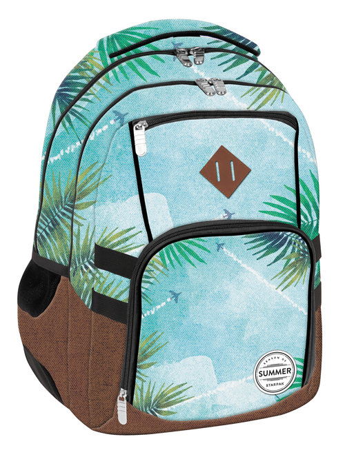 Plecak młodzieżowy z kolekcji Starpak składający się z jednej obszernej komory zapinanej na zamek oraz trzech przednich kieszeni w tym jednej z organizerem. Po bokach znajdują się kieszenie z siateczki na napój z dodatkowym zabezpieczeniem w postaci zapinanych pasków. Wewnątrz znajduje się kieszeń na laptop. Usztywniane plecy i mocne ramiona zostały wyścielane gąbką. Dopasowując się do pleców, zapewniają komfort noszenia. Plecak przyozdobiony atrakcyjnym i młodzieżowym designem. Zapoznaj się również z innymi produktami Starpak dedykowanymi młodzieży! Plecak jest wyrobem tekstylnym. Przeznaczony dla dzieci w wieku: 3+. Wymiary produktu(wys.x szer. x gł.) [cm]: 46,5x33,5x22.
