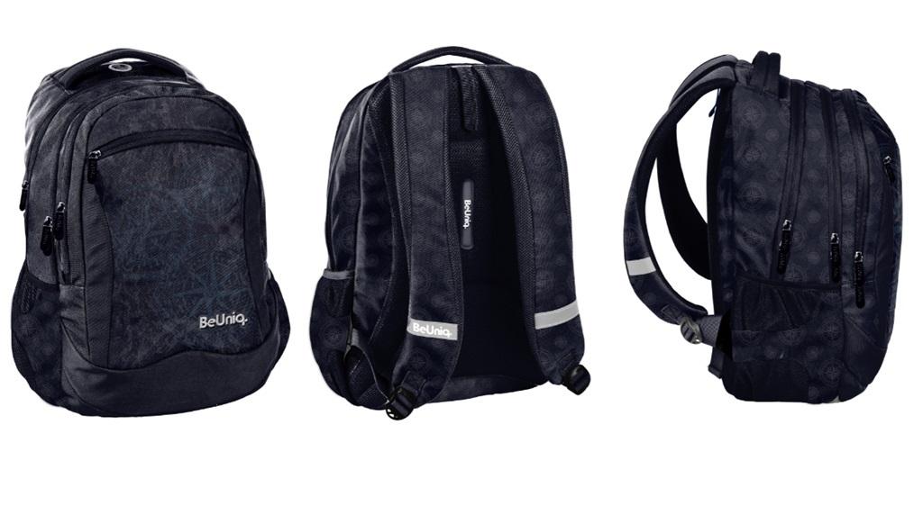 Plecak szkolny. Trzy pojemne komory, kieszeń przednia z organizerem, 2 boczne kieszenie z siatki+materiał. Wzmocnione profilowane plecy, miękkie wygodne szelki. Wzmocniony i usztywniony spód. Wygodny uchwyt do przenoszenia i uszko do powieszenia. W komorze głównej przegroda (na laptop), w drugiej komorze organizer z kieszenią na zamek, uchwyt na klucze. Elementy odblaskowe dla większego bezpieczeństwa. Wykonany z materiału wodoodpornego.