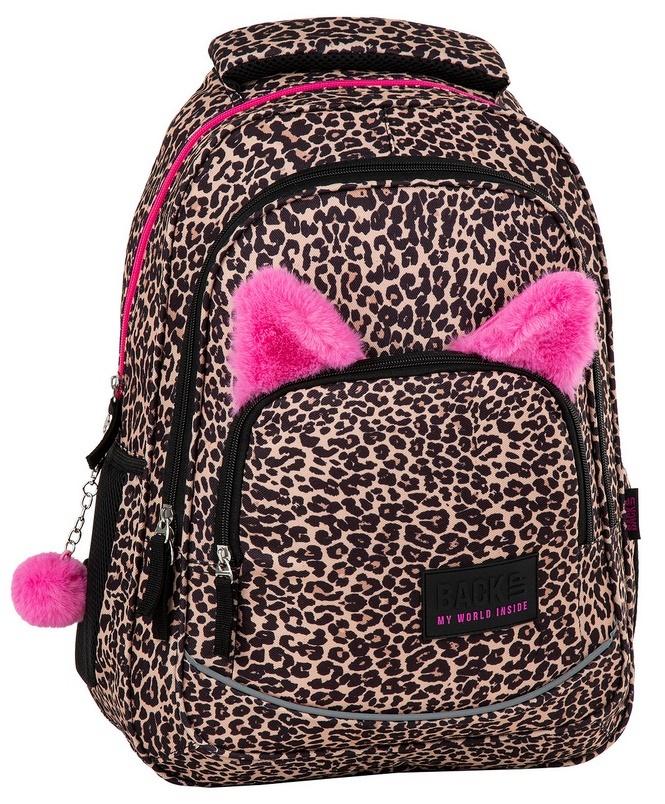 Plecak BackUP model X 91 w niezwykle modną w tym sezonie panterkę został zaczepnie wykończony futrzanymi, różowymi uszami i dużym brelokiem pomponem, dla najsłodszej dziewczyny w klasie. Nazwa wzoru: leopard. W zestawie brelok do kluczy - gratis. Wyposażenie: - 3 duże komory - 2 boczne kieszenie na napój - wygodne, ergonomiczne szelki - wygodny uchwyt do przenoszenia plecaka i dodatkowy uchwyt do powieszenia - ergonomiczne, usztywnione plecy wyprofilowane oddychającą pianką - dyskretny odblask na szelkach i na froncie - kieszenie na tablet i laptop - poręczny organizer z kieszonką nazamek.