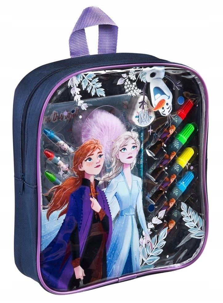 Zestaw do kolorowania Kraina Lodu w plecaku z przezroczystym przodem. Zawartość: 1 ołówek z efektem folii i gumką, 1 brokatowy długopis żelowy z nakładką na pompon, 5 markerów, 5 kredek, 1 papierowy arkusz naklejek A5, 4 plakaty A5, 4 białe kartki, sklejone ze sobą na szczycie.