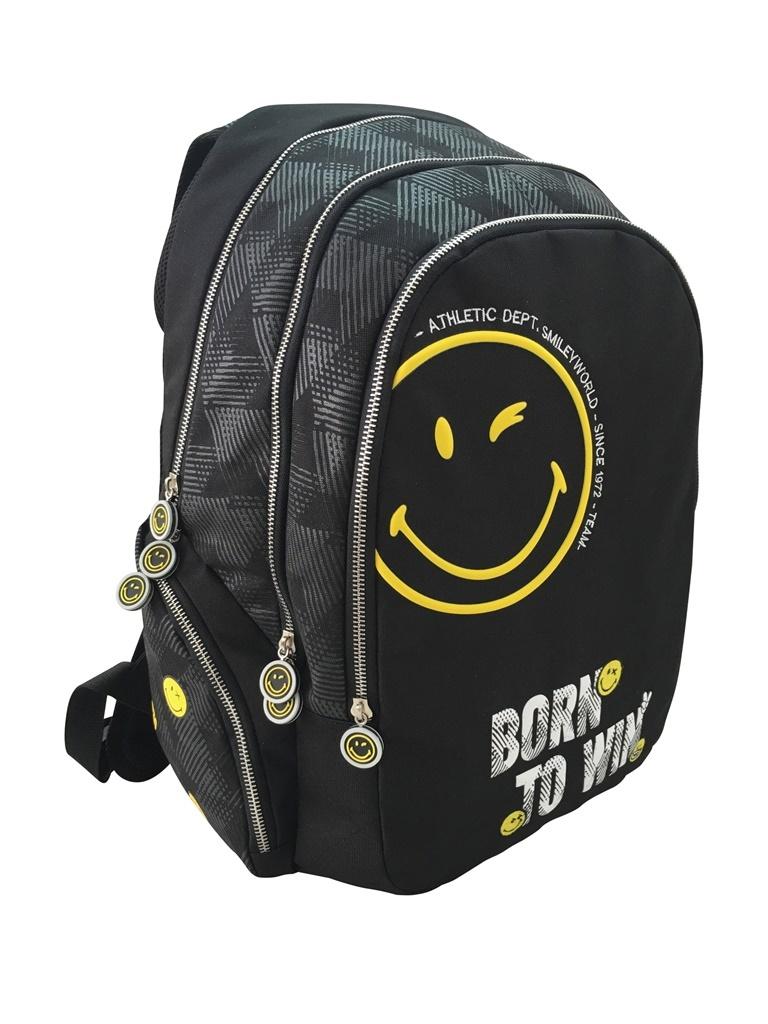Wspaniały plecak młodzieżowy w oryginalnej licencji Smiley World. Jego praktyczna budowa oraz modny design prosto sprawiają, że będzie doskonałym towarzyszem zarówno w lekkie dni szkolne jak i podczas wypadu do miasta. Cechy plecaka: - pojemna komora główna zapinana na suwak - dwie mniejsze komory zapinane na suwak - dwie kieszenie boczne z materiału na bidon i akcesoria - miękko wyściełane, oddychające plecy - szerokie, dopasowane szelki oddychające z regulacją - uchwyt do zawieszenia plecaka - metalowe suwaki w kolorze srebrnym - oryginalna metka z hologramem Smiley® World THE ORIGINAL SMILEY® BRAND Wymiary: 31,5 x 15 x 45 cm