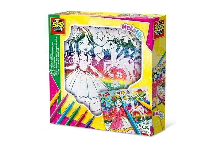 Ten zestaw zawiera wytrzymałe płótno do kolorowania z efektem metalicznym! Ta błyszcząca warstwa nadaje rysunkowi wyjątkowy efekt. Pokoloruj płótno księżniczki i jednorożca sześcioma wesołymi kolorowymi pisakami i podziwiaj swoje dzieło!