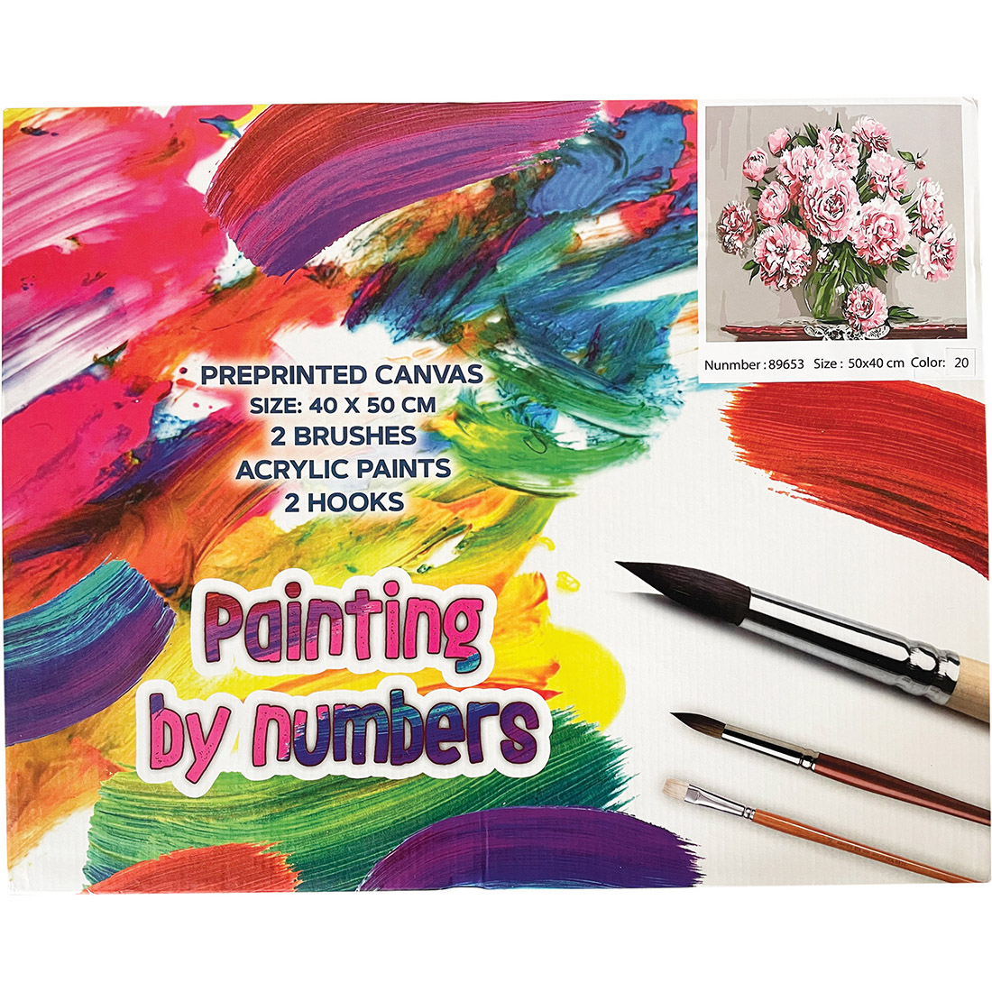 Zestaw do malowania po numerach zawiera: wysokiej jakości płótno rozciągnięte na drewnianej ramie; rozmiar: 40x50 mm; farby przyjazne dla środowiska; trzy pędzelki wykonane z wysokiej jakości materiałów