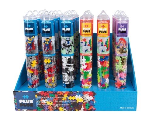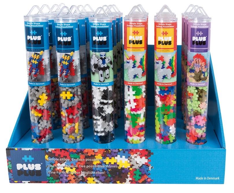 Display Plus-Plus, który świetnie nadaje się do ekspozycji w sklepie. Zawiera 24 tuby: 8x Superbohater, 4x Jednorożec, 4x Syrena, 4x Robot. Każda tuba zawiera 100 elementów.