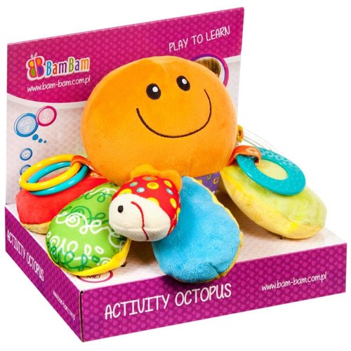 PLUSZOWA OŚMIORNICA z miękkimi, o różnej fakturze materiałów wypustkami, dostarcza dziecku wiele możliwości manewrowania nimi, wydajac przy tym dźwieki lub odgłosy szeleszczenia. Dodatkowe obręcze mogą pełnić role gryzaków. Zabawka poubudza zmysły zwroku, słuchu oraz zdolności manualne. Rozwija zręczność drobnych paluszków. Przeznaczona dla dzieci od 6 m-ca.