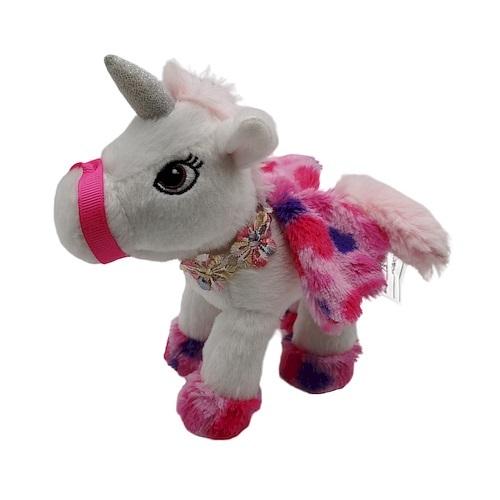 Pluszowy, kolorowy jednorożec to radość dla każdego maluszka. Maskotka ma tęczowe kopyta i skrzydła a na głowie miękki róg.