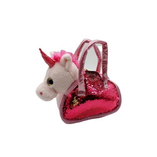 Pluszowy jednorożec to radość dla każdego maluszka. Maskotka umieszczona w cekinowej torbie w kolorze różowym,uwielbianym przez małe księżniczki.