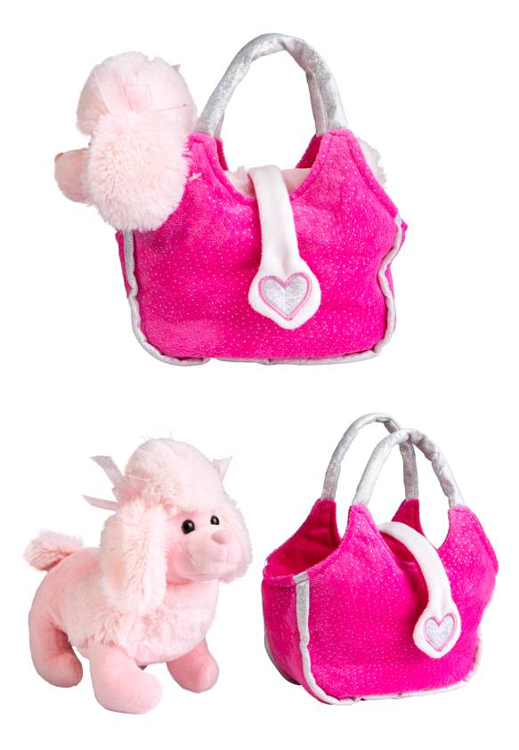 Zawartość zestawu: pluszowy pies pudel, różowa torebka