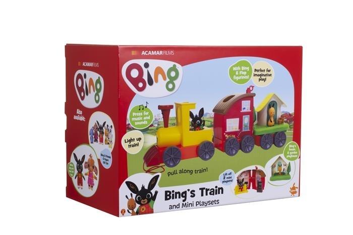 Zestaw składa się z lokomotywy, dwóch wagoników oraz figurek przedstawiających bohaterów bajki Binga i jego najlepszego przyjaciela, a zarazem opiekuna Flopa. Na jednym z wagoników twoje dziecko może umieścić domek króliczka, który otwiera się i zawiera wiele interesujących elementów. Na drugim natomiast domek z drzewem i dekoracyjnymi doniczkami. Lokomotywa po naciśnięciu przycisku zachwyci maluchy efektami świetlnymi oraz dźwiękowymi.