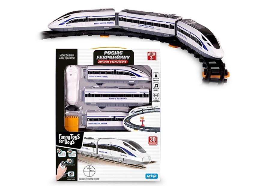 Pociąg na pilota 30 el., w zestawie: 2 lokomotywy, wagon, tory, drzewa, znaki, pilot, długość toru 176 cm., funkcje: dźwięk, światło