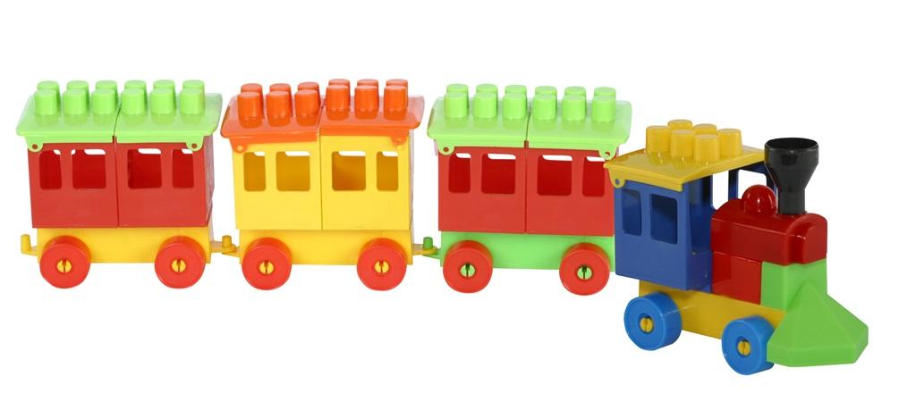 Zabawka przedstawia model pociągu, który został wykonany z klocków. W zestawie znajduje się lokomotywa oraz 3 wagony.