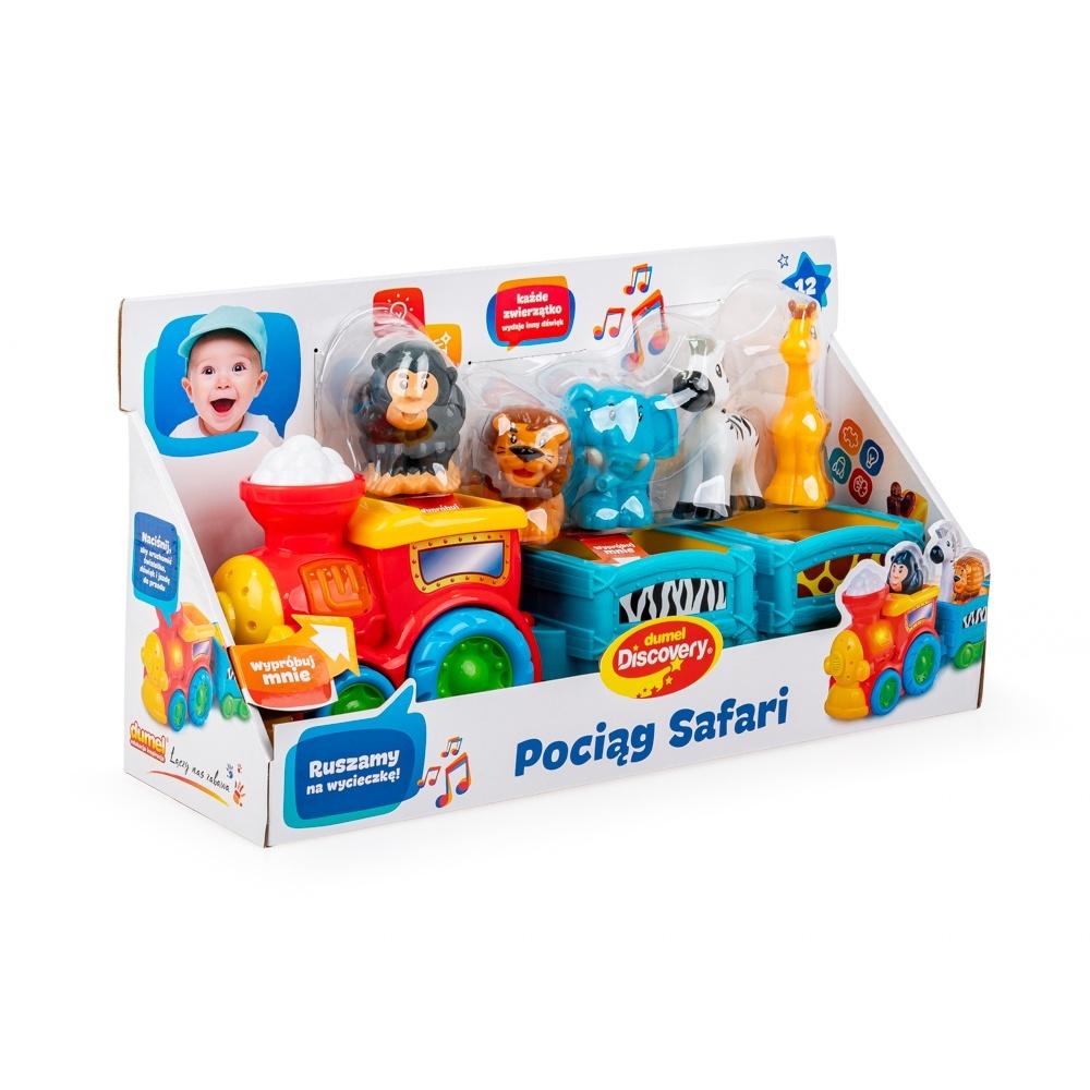 Ciuchcia z dwoma wagonikami wiezie dzikich pasażerów, a każde z pięciu zwierzątek ma w tym kolorowym składzie swoje miejsce! Umieść czworonożnych pasażerów na odpowiednich siedzonkach, aby posłuchać egzotycznych odgłosów. Pociąg wyposażony jest w świecący przycisk, który uruchamia realistyczny dźwięk i funkcję jazdy do przodu. Przejażdżkę umili wesoła melodia.