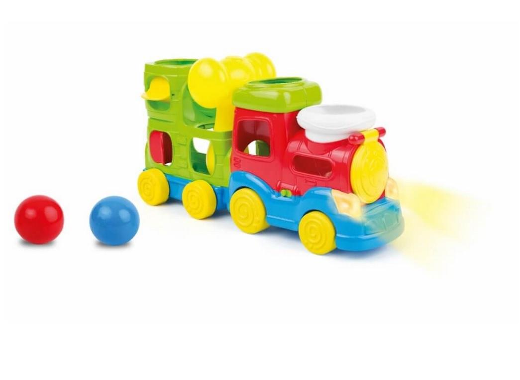 Wesoła zabawa muzycznym pociągiem. Pociąg z wagonem gra wesołe melodie, wydaje różne dźwięki i miga światełkami. Zapewnia świetną, radosną zabawę. Różnorodne piłeczki to okazja do nauki kolorów. Obserwowanie ruchu piłeczek pomoże zrozumieć związek przyczyna-skutek, a także rozwinie orientację przestrzenną dziecka. Wbijanie piłeczek i obserwowanie ich ruchu to bardzo dobre ćwiczenie sprawności motorycznej dziecka i koordynacji ręka-oko. Wiek 18m+