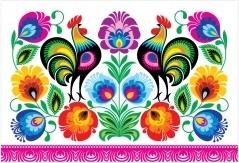 Łowicka pocztówka folk - biała kodra z kogutami.