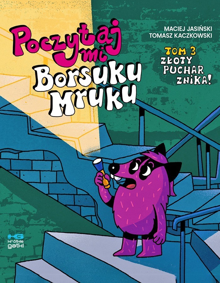 "Trzecia samodzielna przygoda Borsuka Mruka, słynnego asystenta detektywa Misia Zbysia! Przygody pary komiksowych detektywów: Misia Zbysia i Borsuka Mruka już od trzynastu lat bawią i ekscytują młodych czytelników serii „Detektyw Miś Zbyś na tropie”. Jednak czasami Borsuk Mruk jest zmuszony działać sam i o tych śledztwach opowiada w serii książeczek „Poczytaj mi, Borsuku Mruku”. Trzecie śledztwo Mruka toczy się w szkole, do której uczęszczał nasz bohater. Pewnego dnia z gabloty znika Złoty Puchar, najcenniejsze trofeum, jakie w zawodach sportowych zdobyła szkolna drużyna. Zanim za sprawę zabierze się Miś Zbyś, detektywistyczna legenda, Borsuk postanawia zbadać miejsce kradzieży i ruszyć tropem pozostawionych tam śladów."