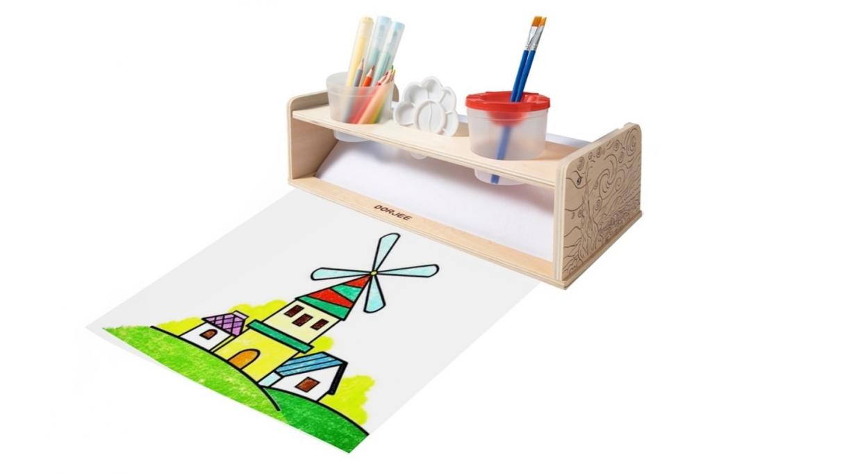Drewniany stojak na rolki papieru Dorjee jest wykonany z litego drewna. Dodatkowo zawiera wszystko, czego potrzebujesz na początek, w tym wysokiej jakości rolkę papieru, kubeczki na farbę, pędzle i paletę kolorów. Marzenie każdego małego artysty!