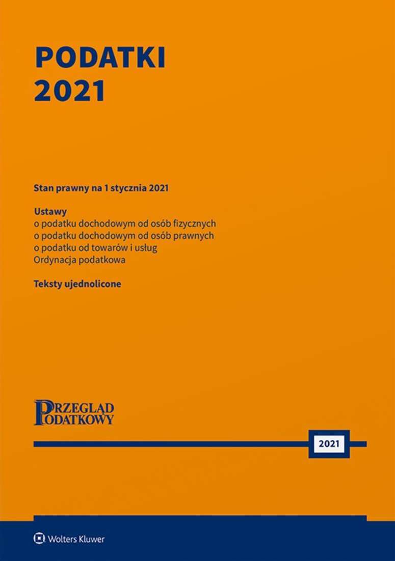 Podatki 2021 to zbiór najważniejszych przepisów podatkowych zawierający najnowsze zmiany wprowadzone przez ustawodawcę. W publikacji znajdziesz teksty ustaw: - o podatku dochodowym od osób fizycznych, - o podatku dochodowym od osób prawnych, - o podatku od towarów i usług, - Ordynacji podatkowej. Wszystkie akty prawne zostały przygotowane ze stanem prawnym na 1 stycznia 2021 r.