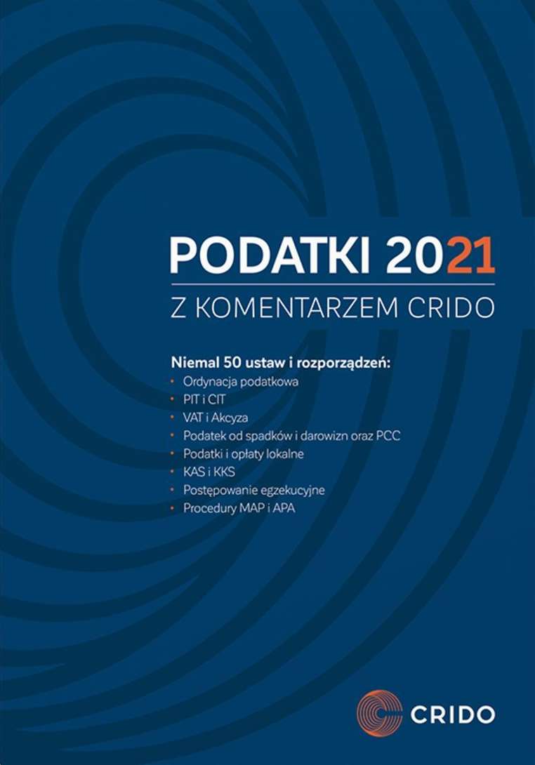 Podatki 2021 z komentarzem Crido to pierwszy na rynku, wydawany już od 2015 roku, kompleksowy zbiór aktualnych przepisów podatkowych z komentarzem do wybranych ustaw oraz praktycznymi opracowaniami przygotowanymi przez praktyków z wieloletnim doświadczeniem – doradców podatkowych z Crido(Link do innej strony). Niemal 50 aktualnych aktów prawnych z zakresu prawa podatkowego – ustaw oraz rozporządzeń, m.in.: - Ordynacja podatkowa - PIT i CIT - VAT i Akcyza - Podatek od spadków i darowizn i PCC - Podatki i opłaty lokalne - KAS i KKS - Postępowanie egzekucyjne - Procedury MAP i APA - „Tarcze Antykryzysowe” – praktyczne mapowanie wybranych instrumentów wsparcia i regulacji antykryzysowych oraz przygotowane przez ekspertów Crido(Link do innej strony) tabele i schematy, dotyczące m.in.: - podatku u źródła oraz klauzuli nieruchomościowej w umowach o UPO, - obowiązków w zakresie cen transferowych, - terminów przedawnień zobowiązań podatkowych, - ulgi abolicyjnej oraz porównania wysokości podatku przy różnych formach opodatkowania przychodów, - ewidencji sprzedaży i zakupu. Podatki 2021 z komentarzem Crido, to publikacja, która ułatwia codzienną pracę osób odpowiadających za kwestie podatkowe w organizacjach.