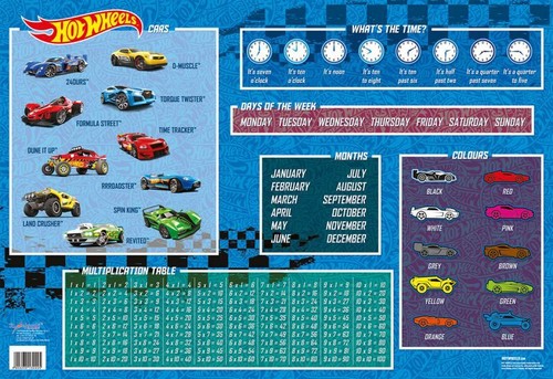 Podkład chroniący biurko przed nadmierną eksploatacją. Wykonany jest ze sztywnej tektury oklejonej z dwóch stron elegancką okleiną. Z jednej strony motywy graficzne Hot Wheels, z drugiej walory edukacyjne (w zależności od licencji: tabliczka mnożenia, mapa, podstawy języka angielskiego). Jest to idealna pomoc dla dzieci rozpoczynających edukację.