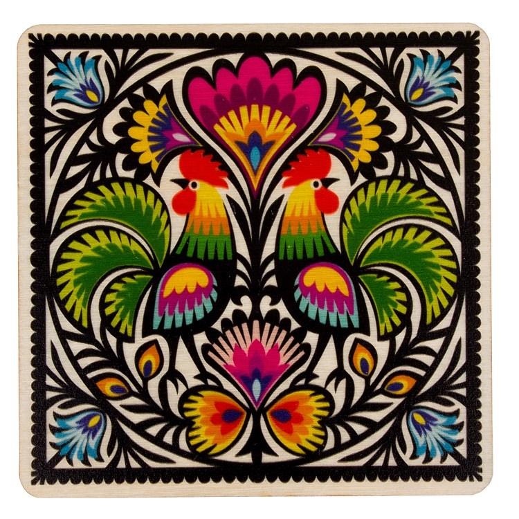Folk podkładka pod kubek przedstawiająca elementy z tradycyjnej wycinanki łowickiej - dwa koguty eko: w żywych kolorach wykonany z drewnianej sklejki,