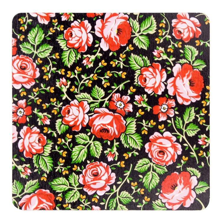 Folk podkładka pod kubek przedstawiająca tradycyjne ludowe wzory z tkaniny góralskiej - czarna: w żywych kolorach wykonana z drewnianej sklejki,