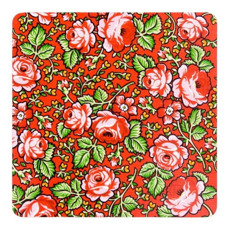 Folk podkładka pod kubek przedstawiająca tradycyjne ludowe wzory z tkaniny góralskiej - czerwona:w żywych kolorach wykonana z drewnianej sklejki,