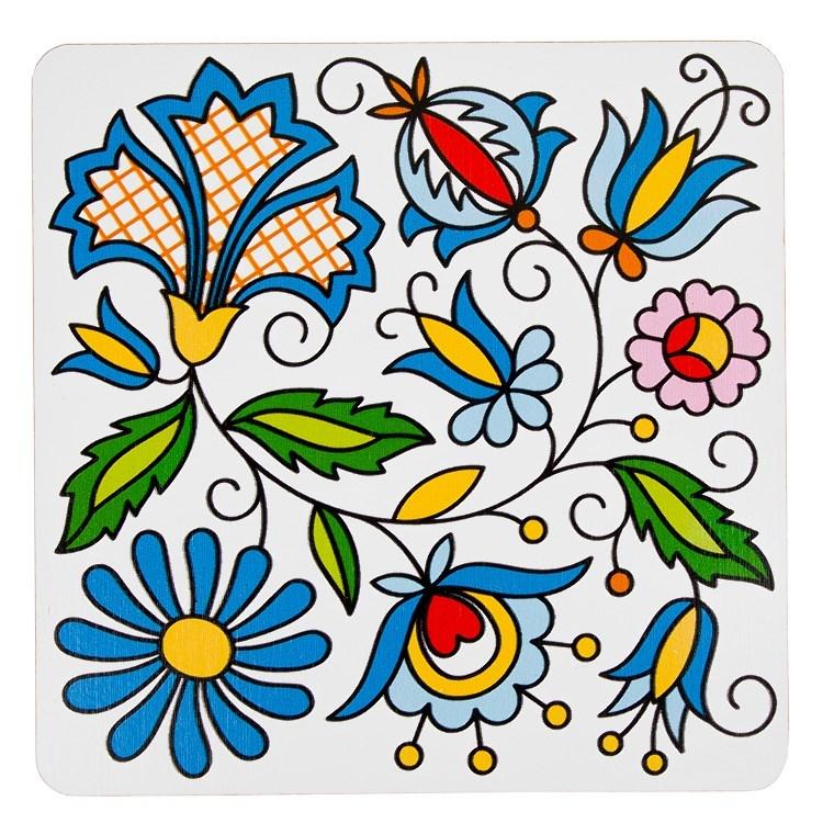 Folk podkładka pod kubek przedstawiająca tradycyjne motywy w kaszubskich haftów: w żywych kolorach wykonana z drewnianej sklejki,nadruk cyfrowy - zainspirowany kaszubskimi haftami,kolorowy nadruk wykonany na białym tle,