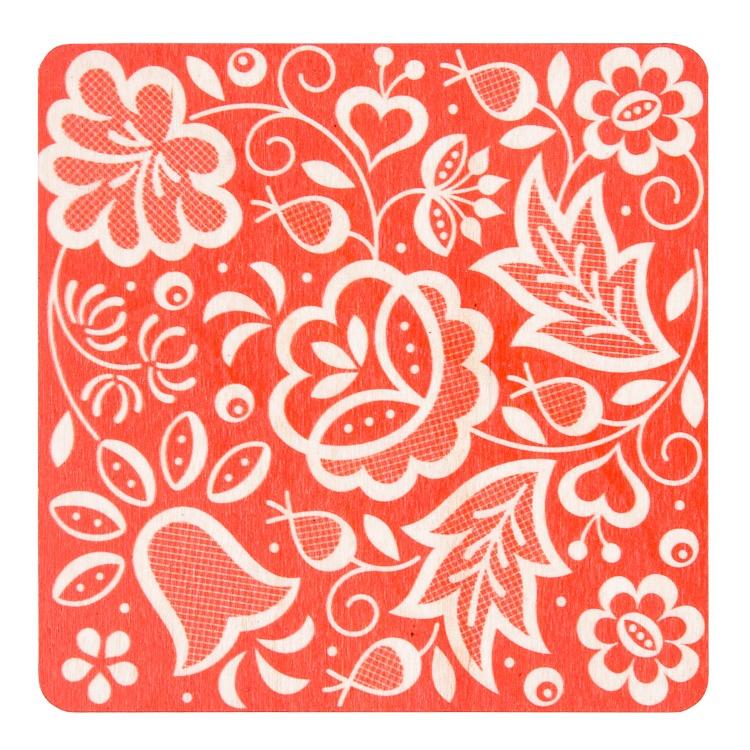 Folk podkładka pod kubek przedstawiająca tradycyjne motywy z kujawskich haftów - czerwona: w żywych kolorach wykonana z drewnianej sklejki,nadruk cyfrowy - zainspirowany kujawskimi haftami,kolorowy nadruk wykonany na czerwonym tle,podkładka kujawska zachwyca intensywną gamą kolorów,