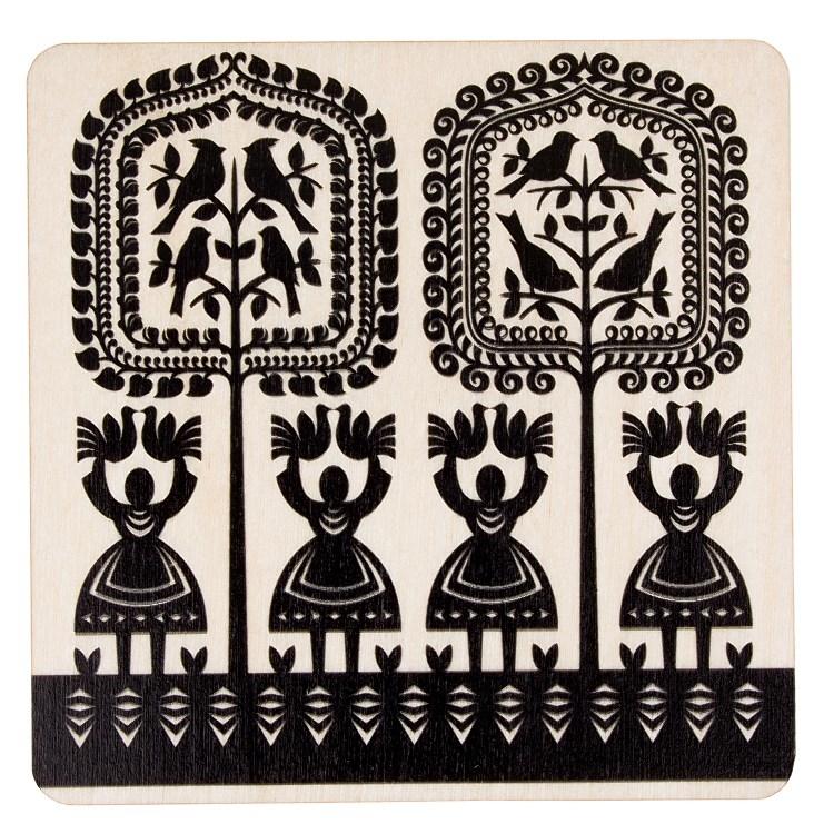 Folk podkładka pod kubek przedstawiająca tradycyjną wycinankę kurpiowską - leluje - eko:wykonana z drewnianej sklejki,nadruk cyfrowy - zainspirowany kurpiowską wycinanką,czarny nadruk wykonany na naturalnym kolorze drewna,podkładka kurpiowska zachwyca intensywnymi kolorami