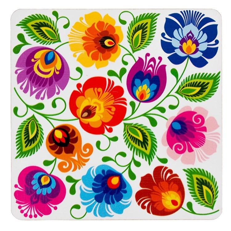 Folk podkładka pod kubek przedstawiająca kwiaty z tradycyjnej wycinanki łowickiej - łowickie białe: w żywych kolorach wykonany z drewnianej sklejki,