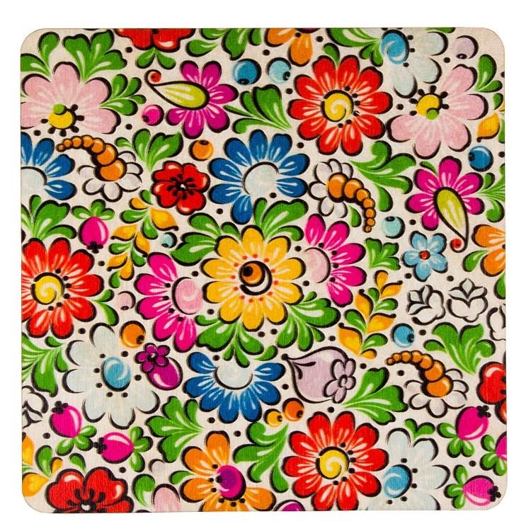 Folk podkładka pod kubek przedstawiająca tradycyjny wzór z opolskich kroszonek - eko: w żywych kolorach wykonana z drewnianej sklejki,nadruk cyfrowy - zainspirowany opolską porcelaną,kolorowy nadruk wykonany na naturalnym kolorze drewna,podkładka opolska zachwyca intensywną gamą kolorów,zdobienia na folk podkładce stylizowane na ludowo,stwórz swoje folk wnętrze,podkładki korkowe to doskonały upominek w stylu folk dla każdego,
