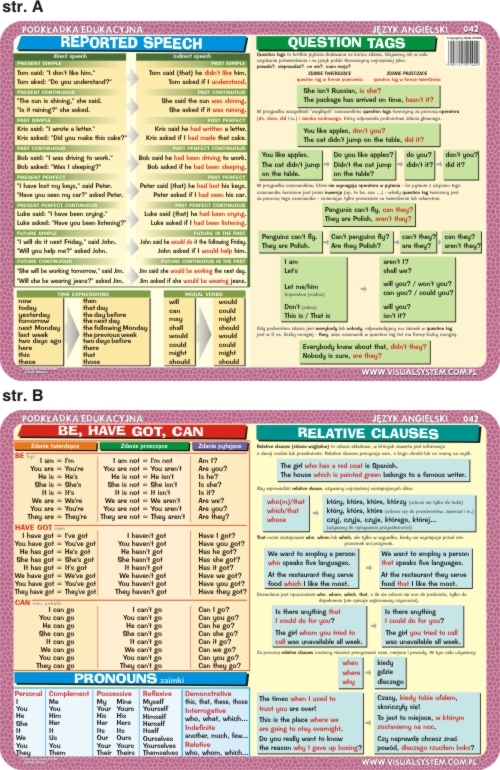 Dwustronna podkładka edukacyjna - prezentuje zagadnienia z zakresu: be, have got, can, pronouns, relative clauses, reported speech, question tags. Format 40 x 30 cm. Usztywniona, ale jednocześnie elastyczna, dwustronnie foliowana. Wchodzi w skład zestawu 60 podkładek edukacyjnych zawierających kilkaset tematów pomocnych w utrwalaniu wiedzy, rozwijaniu zainteresowań, w nauce oraz zabawie.