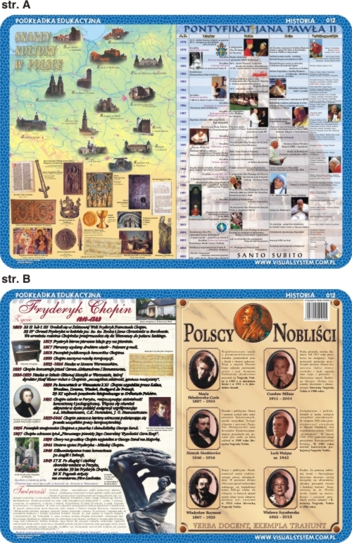 Laminowana i elastyczna podkładka na biurko praktyczna pomoc w nauce, o wymiarach 40x30 cm, F.Chopin, polscy nobliści, skarby kultury w Polsce, pontyfikat Jana Pawła II
