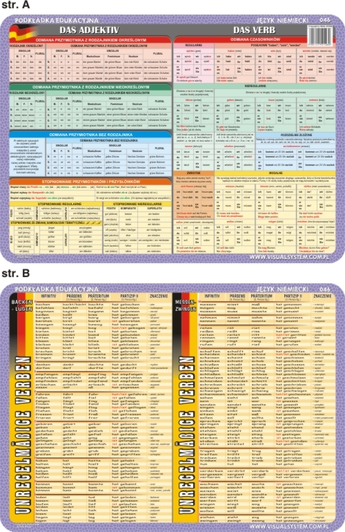 Dwustronna podkładka edukacyjna - prezentujezagadnienia z zakresu: das Adjektiv, das Verb, unregelmaßige Verben. Format 40 x 30 cm. Usztywniona, ale jednocześnie elastyczna, dwustronnie foliowana. Wchodzi w skład zestawu 60 podkładek edukacyjnych zawierających kilkaset tematów pomocnych w utrwalaniu wiedzy, rozwijaniu zainteresowań, w nauce oraz zabawie.