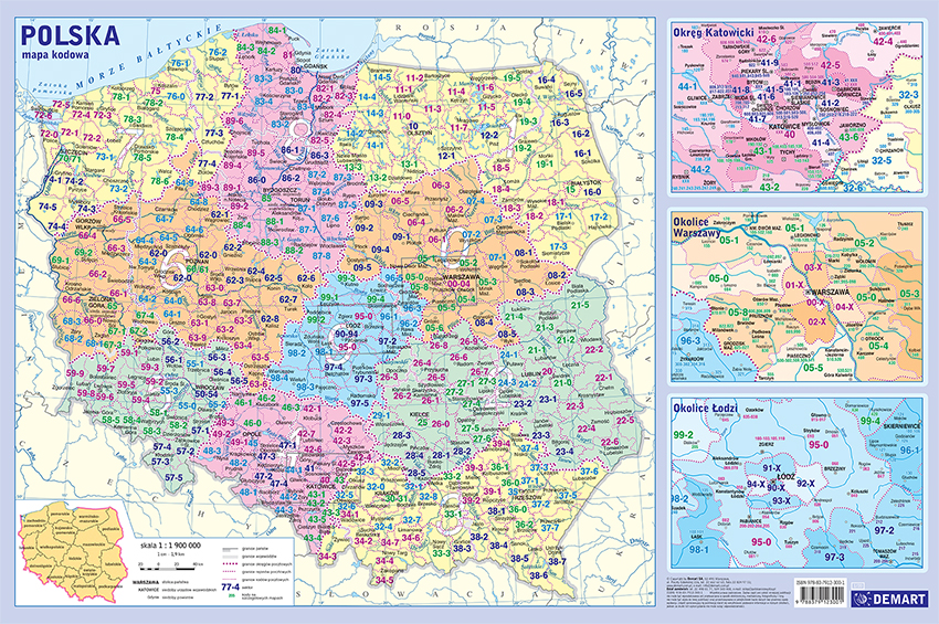 Na mapie Polski w skali 1 : 1 900 000 przedstawiono podział administracyjny i pocztowy Polski. Oprócz cyfrowych oznaczeń kodowych przedstawione są granice okręgów, rejonów i kodów pocztowych. Różnymi kolorami zostały wyróżnione obszary 16 województw, a w ich obrębie zaznaczono granice powiatów. Większym fontem podpisano siedziby władz wojewódzkich, przeważnie urzędujące w jednym mieście, tylko w przypadku dwóch województw: kujawskopomorskiego i lubuskiego w dwóch ośrodkach wojewoda i sejmik wojewódzki . Mniejsze opisy wskazują siedziby władz powiatowych lub nazwy powiatów niewywodzące się od nazw tych miast np. powiat łódzki wschodni. Obok mapy znajdują się trzy powiększenia okolic Warszawy, okolic Łodzi i GOPu w sklai 1 : 1 000 000.