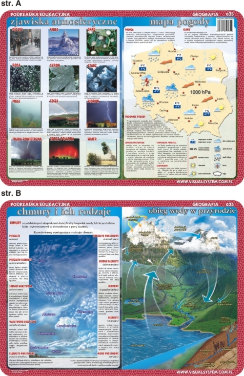 Laminowana i elastyczna podkładka na biurko, praktyczna pomoc w nauce, o wymiarach 40x30 cm, Mapa pogody, zjawiska atmosferyczne, chmury i ich rodzaje, obieg wody w przyrodzie
