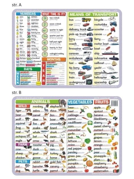 Dwustronna podkładka edukacyjna - prezentuje słownictwo z zakresu: Numbers, what time is it?, days, months, means of transport, vegetables, fruits, animals. Format 40 x 30 cm. Usztywniona, ale jednocześnie elastyczna, dwustronnie foliowana. Wchodzi w skład zestawu 60 podkładek edukacyjnych zawierających kilkaset tematów pomocnych w utrwalaniu wiedzy, rozwijaniu zainteresowań, w nauce oraz zabawie.